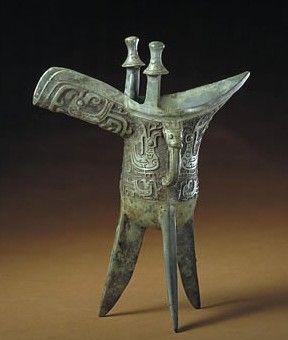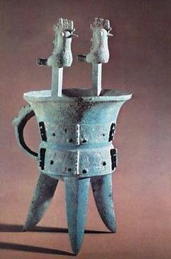 斝是(jia)是青铜礼器的一种,盛行于商周时期,一般为盛酒行裸礼(古代酌酒灌地的祭礼)之器,兼可温酒。凤柱斝铸于商代晚期,原器通高41厘米,口径19.5厘米,重2.9公斤,1973年出土于陕西省歧山县贺家村,现藏于陕西省历史博物馆。