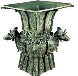 商晚期偏早器。原器1938年出土于湖南省宁乡市,是我国现已发现的较大的方尊,高58.6厘米,重近34.5公斤。此尊造型简洁优美,采用线雕、浮雕 手法,把平面图象与立体浮雕,器物与动物形状有机地结合起来。整个器物用块范法浇铸,一气呵成,鬼斧神工,显示了高超的铸造水平。方尊四角的四只卷角山 羊,以脚踏实地的有力形象承担着尊体的重量,使得这个上边长(52.4厘米)几乎与器高相等的器具显得挺拔、刚劲,丝毫没有头重脚轻之感。羊在古代寓意吉 祥。四羊方尊以四羊、四龙相对的造型展示了酒礼器中的至尊气象。