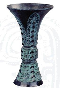 觚(gu)是流行于商代至西周初的饮酒器。整个觚体分为三段,上部器口与细颈为容体,中间的腹部为实心,考古学上称之为“假”腹,下面为圈足。这样的造 型设计符合力学原理,使重心降低,增强了器物的稳定性,显得精巧别致而又不失沉稳庄重。商代酒器最基本的组合是一爵一觚,用以斟饮;也有与斝成组合的。其 形制为圆柱形,器体较高且细,多为喇叭形,通体呈X形。商周时觚非一般饮器,有一句成语为"不能操觚自为",即指觚的多寡与饮者的身份地位、人品、酒量相 关,只有高品位的人方可用此器。
